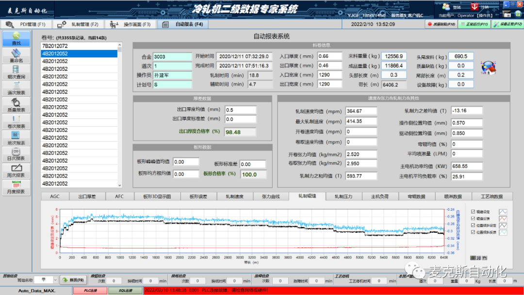 二级数据专家系统介绍视频,强大的数据统计与科技感满满的报表功能,为生产与提效提供了强大的支持!系统包括软硬件环境及网络组建、工艺优化、生产计划、人机界面、自动报表等。实现了生产数据统计及追溯和无纸化办公等功能。
